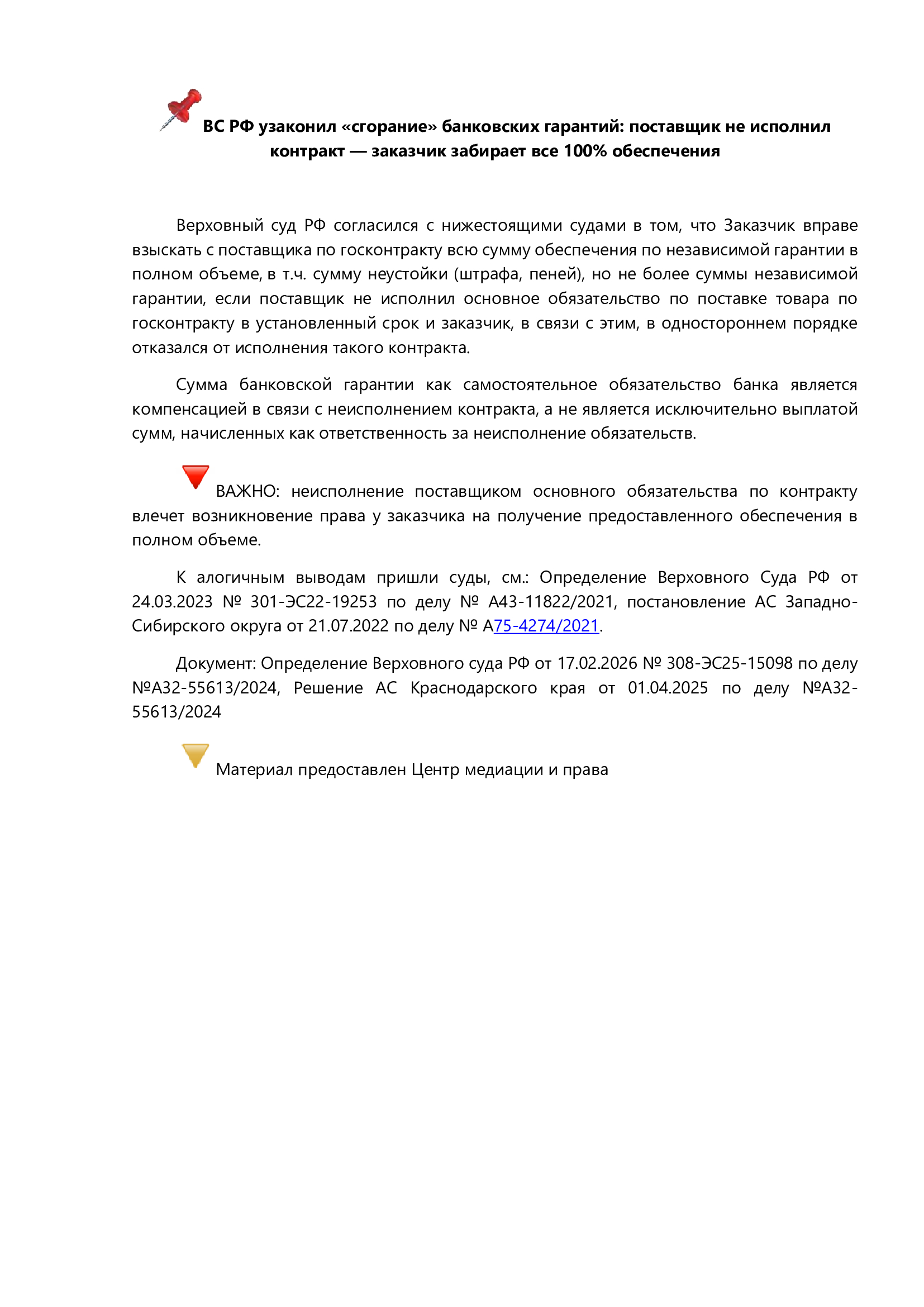ВС РФ узаконил «сгорание» банковских гарантий: поставщик не исполнил контракт — заказчик забирает все 100% обеспечения